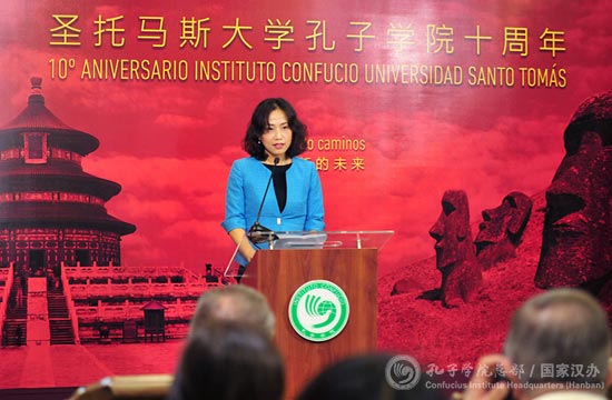 孔子学院总部副总干事/国家汉办副主任静炜女士在讲话中指出,圣托马斯大学是智著名私立高等教育机构,也是总部长期以来亲密的合作伙伴。十年来,在中外双方共同努力下,圣托马斯大学孔子学院取得了丰硕的办学成果。参与孔院举办的各项活动的当地民众,上至六七十岁的老人,下至五六岁的儿童,人数已超过30万,而孔子学院的汉语学习者也达到了1.2万人,圣托马斯大学孔子学院已发展成为智利汉语教学的中坚力量和中智人文交流的重要平台,为推动中智两国在教育、文化、经贸、科技等各个领域的交流与合作,促进中智两国之间的师生和民众相互认识、相互了解作出了重要贡献。静炜主任对圣托马斯大学孔子学院取得的成果表示祝贺,对长期以来支持孔子学院发展的各界朋友表示感谢。