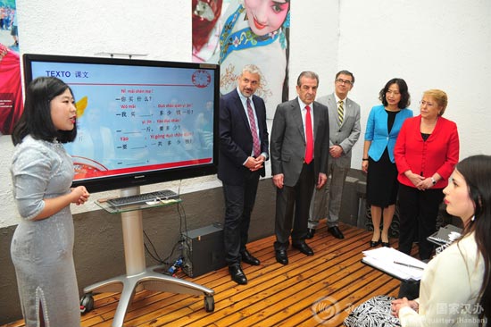 庆典活动伊始,智利总统巴切莱特女士观摩了圣托马斯大学孔子学院的文化展示及汉语课堂。在文化展示环节,巴切莱特总统观看了茶艺与书法展示,品尝了刚刚沏好的中国绿茶,并获赠了由汉语志愿者老师书写的中文名字卷轴;而在汉语课堂上,学生们跟随老师的讲解,学习如何用中文表达买水果、问价钱,总统女士也与当地的汉语学习者亲切沟通,询问他们的汉语学习情况,学生们纷纷表达了对汉语学习的极大热情和兴趣。