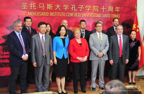 当地时间2017年11月21日上午12时,智利圣托马斯大学在首都圣地亚哥的孔子学院拉丁美洲中心举行了孔子学院十周年盛大庆祝活动,智利总统米歇尔?巴切莱特女士、孔子学院总部副总干事/中国国家汉办副主任静炜女士、圣托马斯大学校长哈依米?瓦特先生、安徽大学校长匡光力先生应邀出席并讲话。此外,智利前总统爱德华多?弗雷、智利文化部部长奥托内、圣地亚哥首都大区区长奥雷格、智利外交部亚太司司长维克多里亚诺及智利外交、文化、教育界政要和中国驻智利大使馆官员等百余人参加了本次活动。