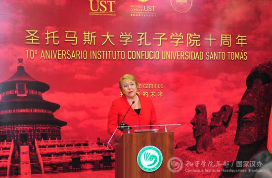 巴切莱特总统指出,在不久前的越南亚太经合组织第二十五次领导人非正式会议上,她与习近平主席进行了亲切会谈,共同见证了中智自由贸易协定升级议定书的签署。作为第一个同新中国建交的南美国家,也是第一个同中国签署自由贸易协定的拉美国家,她认为中国和智利的共同发展对于两国人民来说都是机遇;随着中国经济的快速发展,中文显然已经成为当前世界上最主要的语言之一,而在未来也将成为最有竞争力的语言之一,她希望圣托马斯大学孔子学院能够继续为智利培养出优秀的汉语人才,为中智两国各领域交流沟通提供便利,而她本人也表达了明年三月卸任后到孔子学院习汉语的愿望。