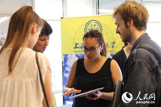 埃娃(右二)说一口流利的汉语,是上海外国语大学展台的志愿者,曾经也在该校交换过一个学期。图为埃娃向法国学生介绍上外的留学生课程项目。