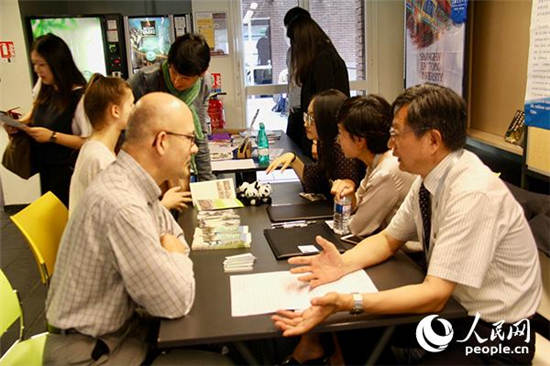 一名法国中文教师正在上北京师范大学展台前咨询情况。
