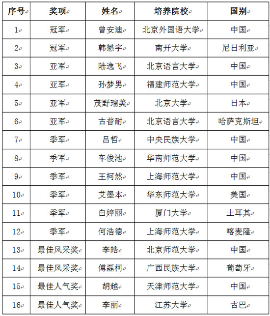 经过专家点评打分,留学生评审团投票,来自北京外国语大学的曾安迪和南开大学的尼日利亚学生韩懋宇分别获第二届“汉教英雄会”中外研冠军,北京语言大学的陆逸飞、福建师范大学的孙梦男、北京大学的日本学生茂野瑠美和北京语言大学的哈萨克斯坦学生古普耐分别获中外研亚军,吕哲、车俊池、王柯然、艾墨本(美国)、白婷丽(土耳其)和何浩德(喀麦隆)分别获中外研季军。