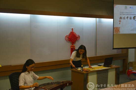 本次文化活动分为文化表演、体验课程、学生展示三个环节。在文化表演环节,志愿者教师们现场演奏古筝,表演书法,让学生们沉浸在浓浓的中华文化氛围之中。表演结束后,志愿者教师为学生们准备了30分钟的“趣味汉字”讲座,用生动有趣的汉字视频、形象易懂的象形字引领学生初探汉字之美。