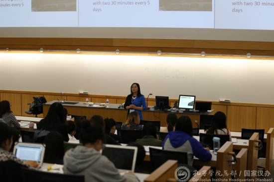 美国堪萨斯大学孔院志愿者教师王悦代表参训学员分享岗中培训收获
